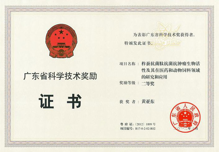 广东省科学技术奖励二等奖-柞蚕抗菌肽抗菌抗肿瘤生物活性及其在医药和动物饲料领域的研究和应用
