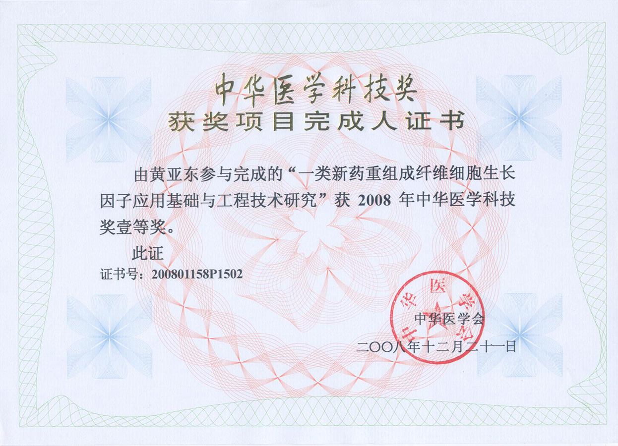 中华医学科技奖一等奖-一类新药重组成纤维细胞生长因子应用基础与工程技术研究